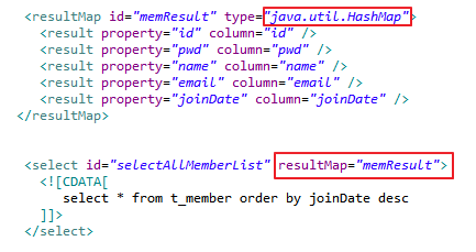 member.xml의 type 속성을 HashMap로 하면 해시맵 형태로 저장할 수 있다. 이때 사용한 id는 memResult이므로, memResult라는 해시맵에 회원 정보가 키, 값 쌍으로 들어있는 것이 된다.