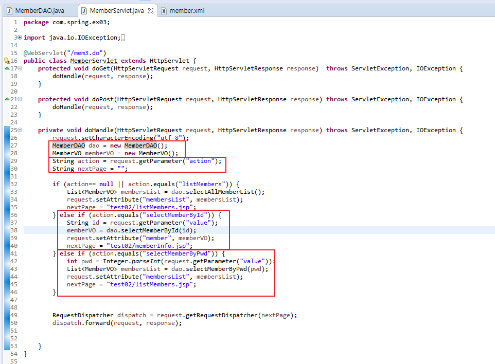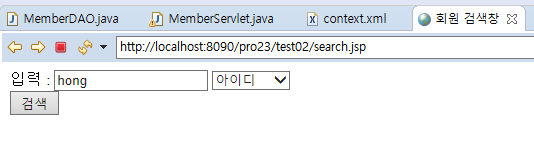 서블릿을 작성한다. 검색 조건이 slelctMemberById라면 전송된 값을 getParam으로 가져와서, SQL문에 id를 전달하여 해당 id값을 조건으로 검색하도록 dao.selectMemberById(id)를 호출한다. 패스워드의 경우에는 패스워드를 전달하여 메서드를 호출한다.