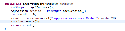 DAO에 insertMember 메소드를 추가한다. SqlSession을 만들고, insert문으로 실행할 sql문의 id(xml에서 설정한 id)와 받아온 추가될 회원 정보 vo를 함께 전달한다. 반드시 commit함을 잊으면 안된다!
