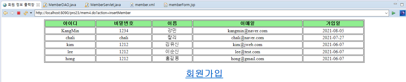 서블릿 캡쳐부분이 어디갔는지 사라졌는데 서블릿에도 구문을 추가해야 한다. 만약 브라우저에서 전송된 action값이 insertMember면 함께 전송된 회원 정보를 가져와서 VO객체에 설정하고, DAO의 insertMember()메서드를 호출하며 인자로 전달해야 한다.