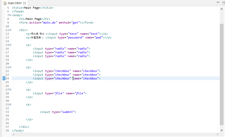 ▲메인 화면이 login.html로 설정 완료된 상태. 로그인을 누르면 <form action="main.do"> 부분을 통해 main.do가 실행되고, main.html로 연결된다.