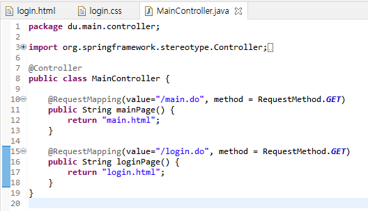 현재는 이런 상태. main.do 라는 요청이 들어오면, main.html을 반환하고, login.do에는 login.html을 반환한다.