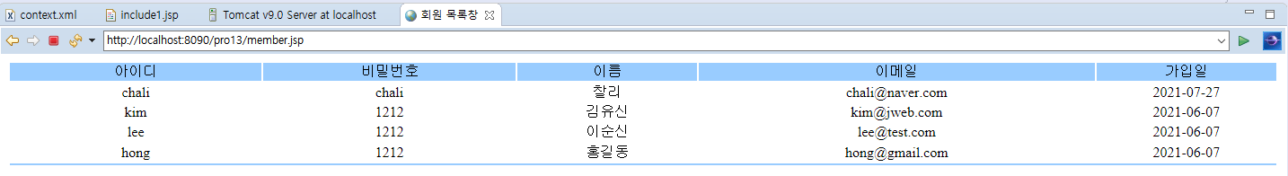 4. 전송되어져 온 정보를 받아 멤버빈 객체를 생성하는 member.jsp를 만든다. List를 사용해 조회한 정보를 하나씩 순차적으로 출력한다.