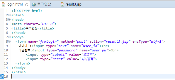 결과창을 만든다. <%@ %> 에 디렉티브 태그를 작성하고, <% 스크립트릿 %> 을 사용해 자바문으로 유저 id와 pw를 받아온다. if문을 사용해 만약 id가 null 이라면 아이디를 입력하라는 문구와 함께 로그인 창으로 이동하는 링크를, 그렇지 않다면 아이디가 admin인지를 검사한다. 아이디가 admin이라면 관리자 로그인 확인 페이지와 함께 표현식으로 아이디와 비밀번호를 출력하고, 그렇지 않다면 유저 id와 함께 환영문구를 출력한다.